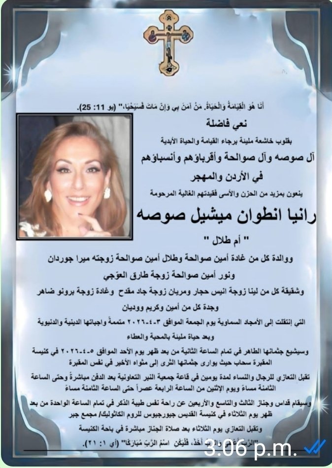 ✝️🕊️ تنعى تعاونية الأرض الطيبة – مادبا، ببالغ الحزن والأسى، الفقيدة المرحومة رانيا أنطوان ميشيل صوصه (أم طلال)سائلين الله العليّ القدير أن يتغمّدها بواسع رحمته،ويسكنها فسيح جناته، ويلهم أهلها وذويها ومحبيها جميل الصبر وحسن العزاء، وأن تكون ذكراها مؤبدة.